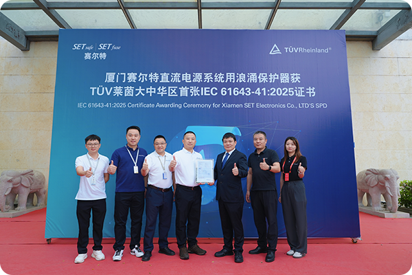 厦门,2025年11月13日,德国莱茵TÜV集团(以下简称“TÜV莱茵”)为厦门赛尔特电子股份有限公司(以下简称“赛尔特”)的低压直流电源系统用电涌保护器(SPD)产品颁发IEC 61643-41:2025认证证书。这一事件标志着赛尔特的SPD产品在低压直流电源系统过电压防护领域的技术实力已达到国际标准要求,为新能源、储能及直流配电系统提供了更可靠的安全保障。