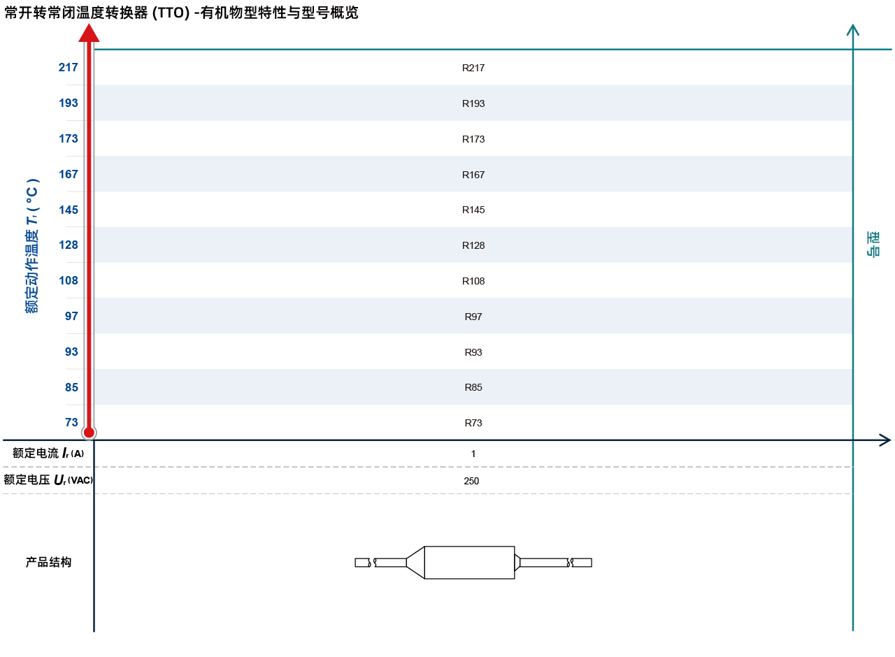 赛尔特公司(SETsafe | SETfuse)有机物型常开转常闭温度转换器(TTO)R系列额定动作温度从73 ℃到217℃,额定电流/电压:1 A / 250 VAC,符合 RoHS 和 REACH 环保法规。