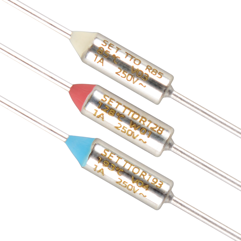 温度保险丝-有机物型 Thermal-Link (OTCO)-Organic Type 是一种以有机化合物作为感温材料且一次性动作而不可复位的温度敏感元件。在正常工作情况下,触点线与可动电极保持接触,电路处于导通状态, 当OTCO感受到异常发热并达到设定的熔断温度时,有机物型感温体熔化,可动电极在直簧的作用下与触点线脱离,从而断开电路。OTCO主要由金属外壳、弹簧、可动电极和感温体等组成。 OTCO产品广泛应用于电气设备的过温度保护。 赛尔特公司 (SETsafe | SETfuse) 的OTCO产品规格:额定动作温度从72 ℃到263 ℃;额定电流:10 A,15/16 A;安规认证包括:UL,cUL,VDE,CCC,KC,PSE,符合 RoHS 和 REACH 。