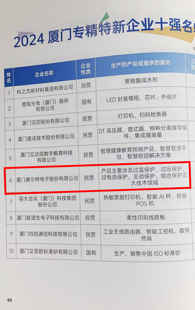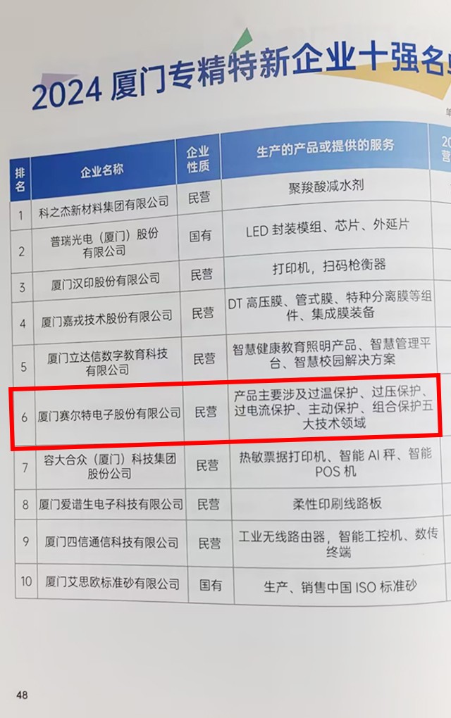 2024厦门专精特新企业十强(第六,2023第八)。2024年11月