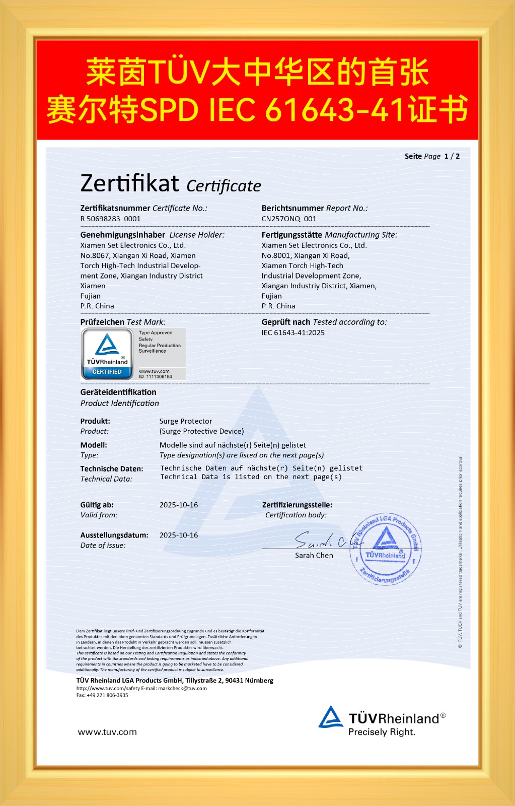 厦门,2025年11月13日,德国莱茵TÜV集团(以下简称“TÜV莱茵”)为厦门赛尔特电子股份有限公司(以下简称“赛尔特”)的低压直流电源系统用电涌保护器(SPD)产品颁发IEC 61643-41:2025认证证书。这一事件标志着赛尔特的SPD产品在低压直流电源系统过电压防护领域的技术实力已达到国际标准要求,为新能源、储能及直流配电系统提供了更可靠的安全保障。