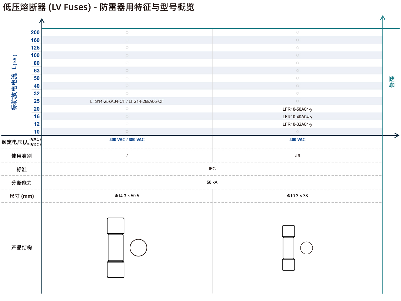 LV Fuses-防雷器用,Un: 400 / 690 VAC // In: 25 kA // I1: 50 kA。