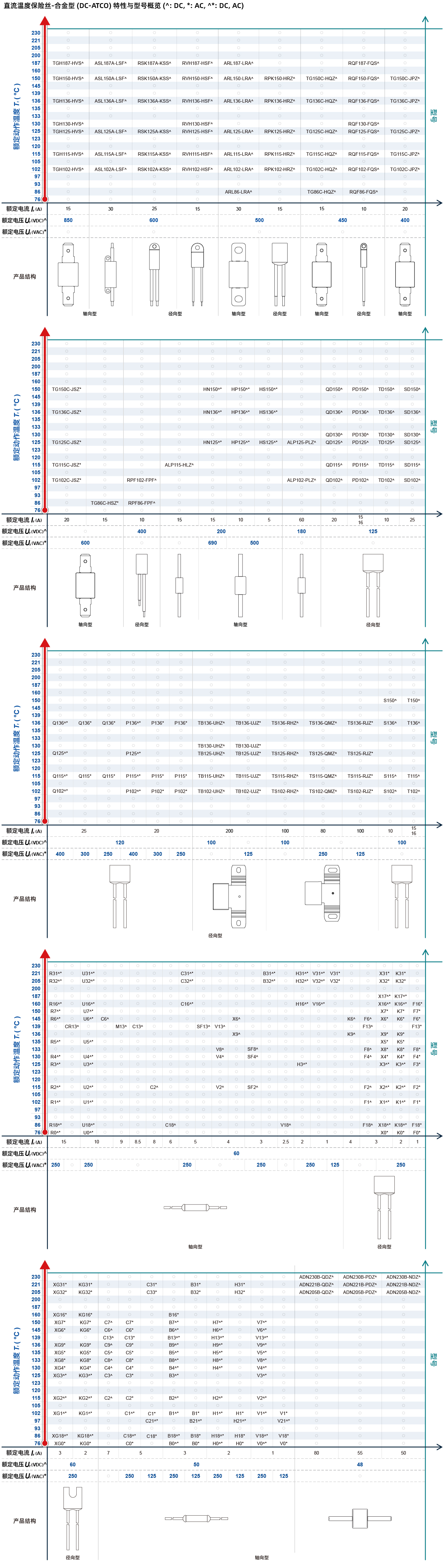 DC-ATCO额定电流 ≥ 所在系统的系统电流,直流电压范围覆盖(24 ~ 850)VDC,例如设计产品标称最高额定电压为400 V,选择温度保险丝的额定电压应大于或等于400 V。