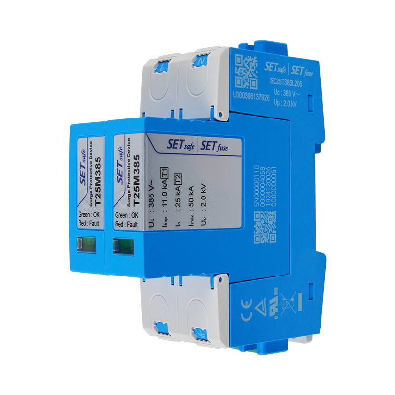 电涌保护器Surge Protection Device(SPD),也叫防雷器,是一种为各种电子设备、仪器仪表、通讯线路提供安全防护的电子装置。当电气回路或者通信线路中因为外界的干扰突然产生尖峰电流或者电压时,电涌保护器(SPD)能在极短的时间内导通分流,从而避免电(浪)涌对回路中其他设备的损害。 电涌保护器(SPD)广泛应用于电源线路、信号线路的过电压保护。对异常电压的吸收,雷击电(浪)涌的吸收等发挥着很大的作用。 赛尔特公司(SETsafe | SETfuse)的电涌保护器(SPD)主要由压敏电阻(MOV)、气体放电管(GDT)、可插拔模块、底座及内外部金属构件组成。标称放电电流:(20 ~ 30)kA;最大连续工作电压:(150 ~ 1000)VAC;最大连续工作直流电压:(180 ~ 1500)VDC ,安规认证:UL、cUL、TUV、CE、CQC、TEL;符合RoHS、REACH要求。